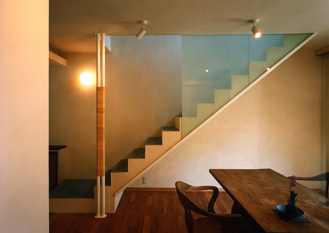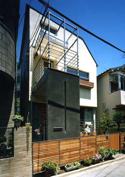 リビングと玄関を半階分持ち上げ、路地からの視線を避けながらも街と前庭を近づけた。ボリュームを後退させ物干しバルコニーを路地に突き出し、1階アプローチを浮かすことで、南東入りの限られた間口でも半地下から上階まで採光と換気を十分取り入るように工夫した。