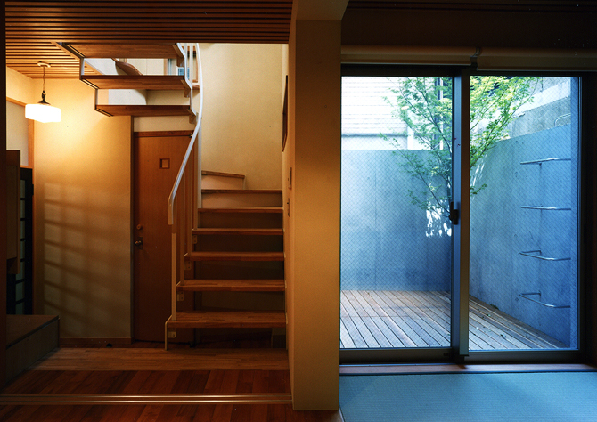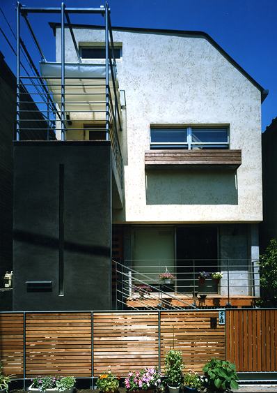 前庭の木々や2階の花台、土の左官の壁など路地に柔らかな表情を作り出している。