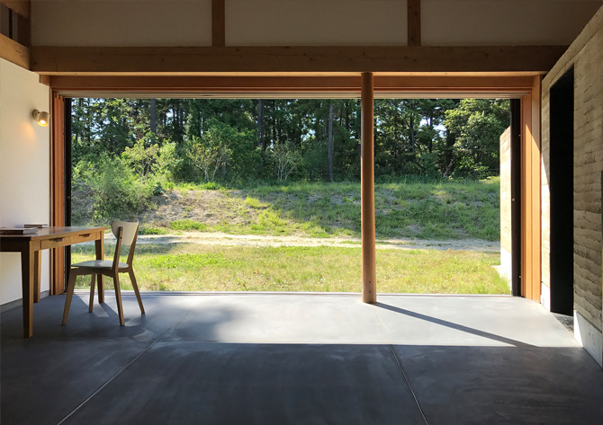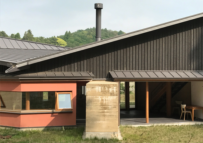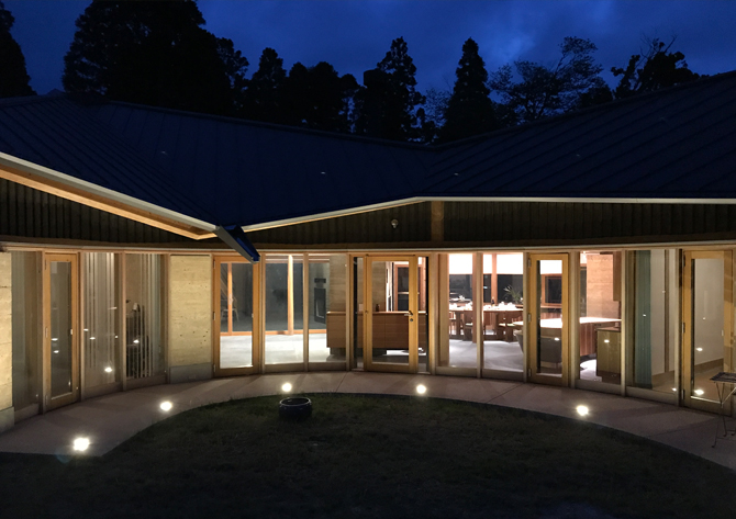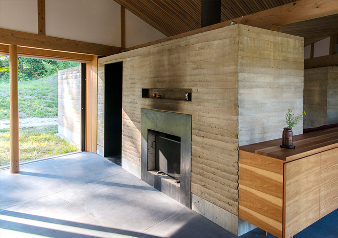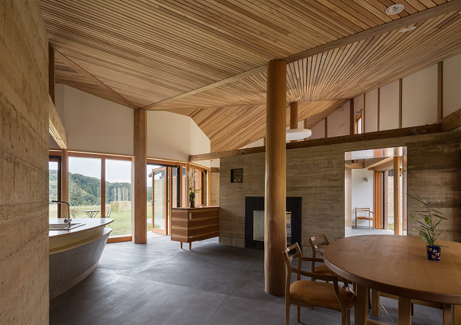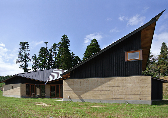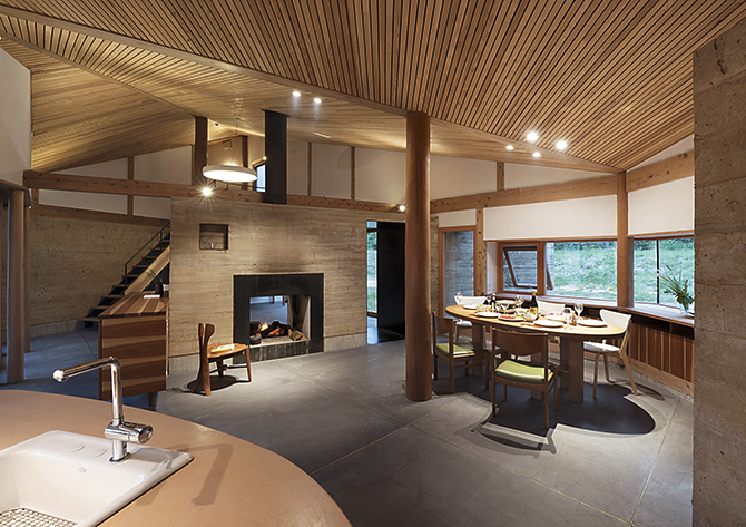 南庭を囲み、暖炉を中心に版築壁を扇状に配し、光が差し込み、風がながれていく。全方位にひらいた自然とともに暮らす家である。読書会、音楽会、料理教室などこの地域の人々が集い、絆を深める場でもある。