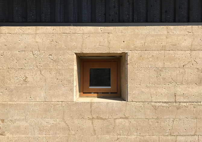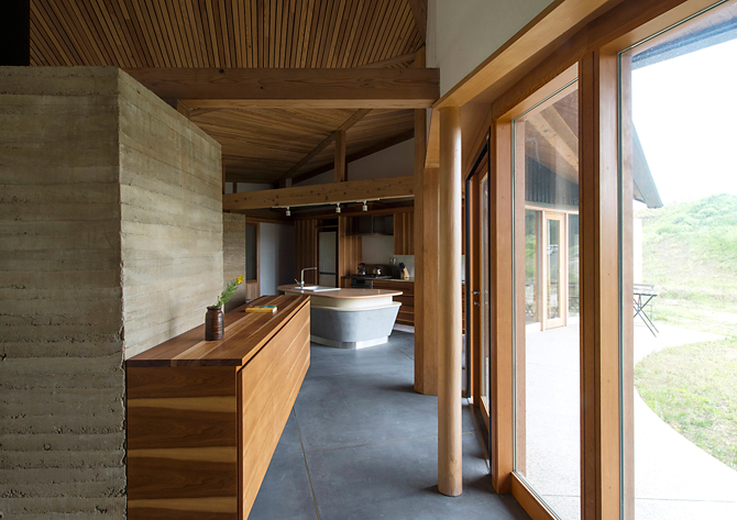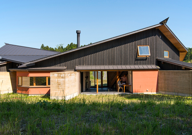 「土」や「杉」や「竹」などその場にある自然素材を地場の「風土資源」と捉え、自然エネルギーを活用した家である。「版築壁」は丸竹と敷地の土を突き固め、「木架構」は近くの杉を丸太や長梁に製材し、地元の「職人の手」で刻み組みあげた。