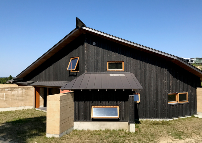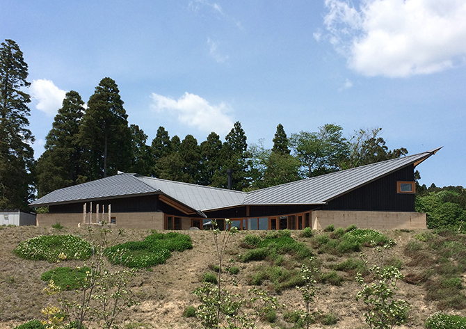大地から生まれた建築である。有機的な渦巻き状の形態は、「フィボナッチ級数」と「尺寸法」の身体寸法からなる。多面体の屋根で集水し、頂上で換気を行う。新建材をなるべくつかわず、温暖化を抑えた環境にローインパクトな「現代の民家」をめざした。